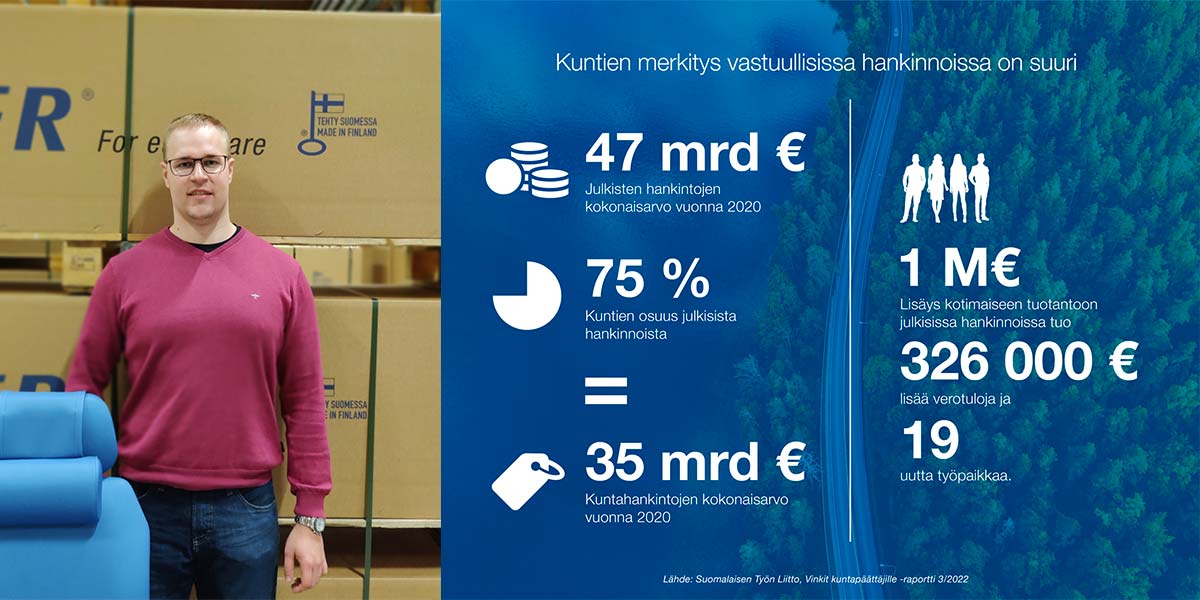 – Vastuullisilla julkisilla hankinnoilla voidaan edistää monia aidosti hyviä asioita, kuten ilmastotyötä, työllistämistä ja huoltovarmuutta. Hankintapuolella koetaan, ettei niitä kuitenkaan voida tarpeeksi hyvin huomioida tarjouspyyntöjen pisteytyskriteereissä, kertoo Suomalaisen Työn Liiton toimitusjohtaja Tero Lausala.